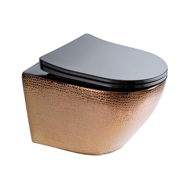 *Dış yüzeyi rose rengi pullu görünüme sahip, siyah kapaklı fonksiyonel asma klozet
